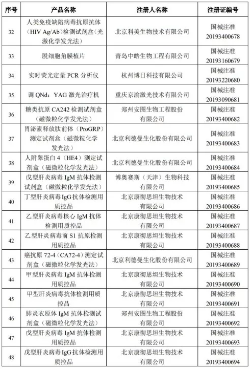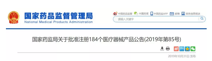 10月31日,國(guó)家藥監(jiān)局發(fā)布《國(guó)家藥監(jiān)局關(guān)于批準(zhǔn)注冊(cè)184個(gè)醫(yī)療器械產(chǎn)品公告(2019年第85號(hào))》。