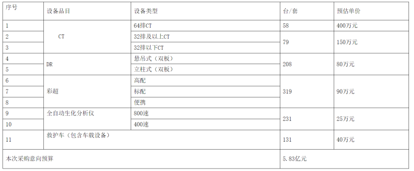 11月16日,河南衛(wèi)健委發(fā)布《河南省縣域醫(yī)共體設(shè)備更新采購需求調(diào)查征集公告》,向全國開展需求調(diào)查。本次采購意向預(yù)算5.83億元,采購設(shè)備包括CT、DR、彩超、全自動生化分析儀、救護(hù)車(包含車載設(shè)備)。