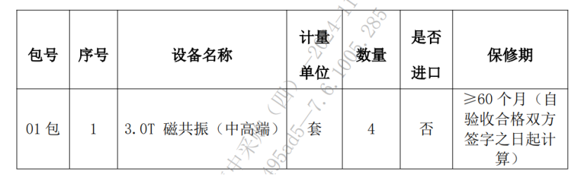 項(xiàng)目四預(yù)算總金額1.02億元。其中,擬采購3.0T 磁共振(中高端)4套,最高限價(jià)6000.00萬元;擬采購3.0T 磁共振(中端)1套,最高限價(jià)1200.00萬元;擬采購1.5T 磁共振2套,最高限價(jià)1200.00萬元;擬采購64排及以上CT 6套,最高限價(jià)1800.00萬元。同樣不允許進(jìn)口。