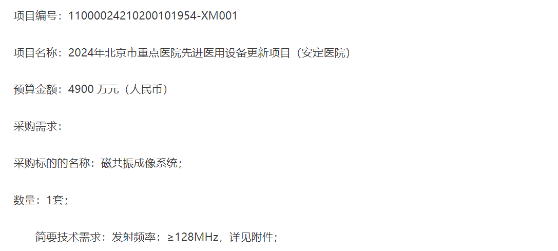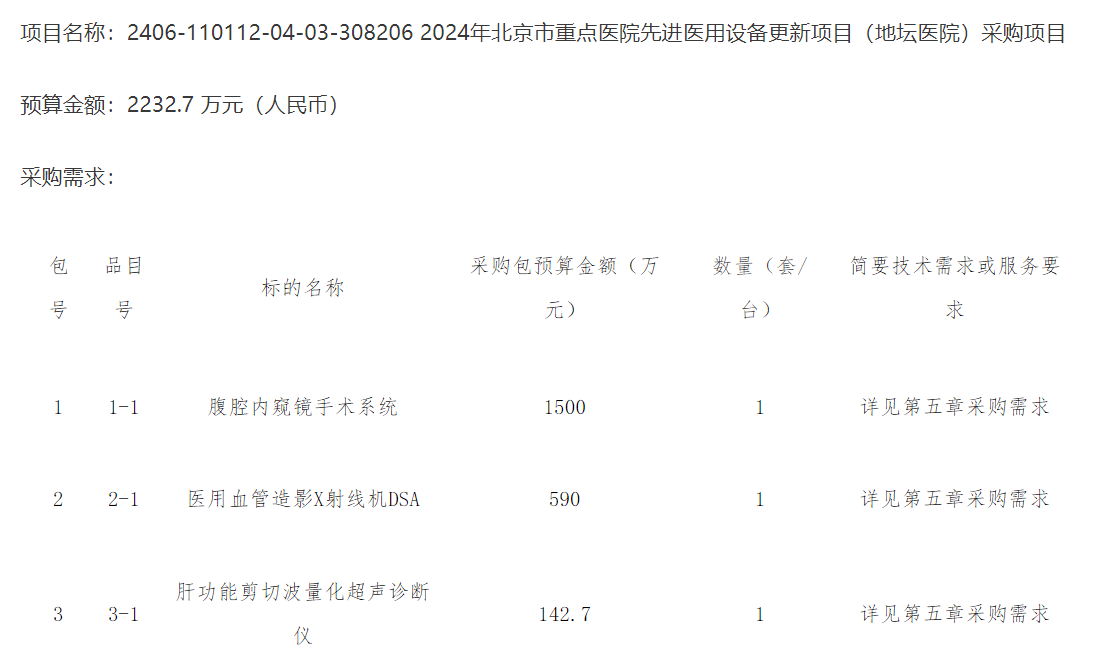 此外,2024年北京市重點(diǎn)醫(yī)院先進(jìn)醫(yī)用設(shè)備更新項(xiàng)目開始招標(biāo)。目前安定醫(yī)院、地壇醫(yī)院相關(guān)采購已發(fā)布招標(biāo)公告,涉及品類包括腹腔內(nèi)窺鏡手術(shù)系統(tǒng)、醫(yī)用血管造影X射線機(jī)DSA、磁共振成像系統(tǒng)等。