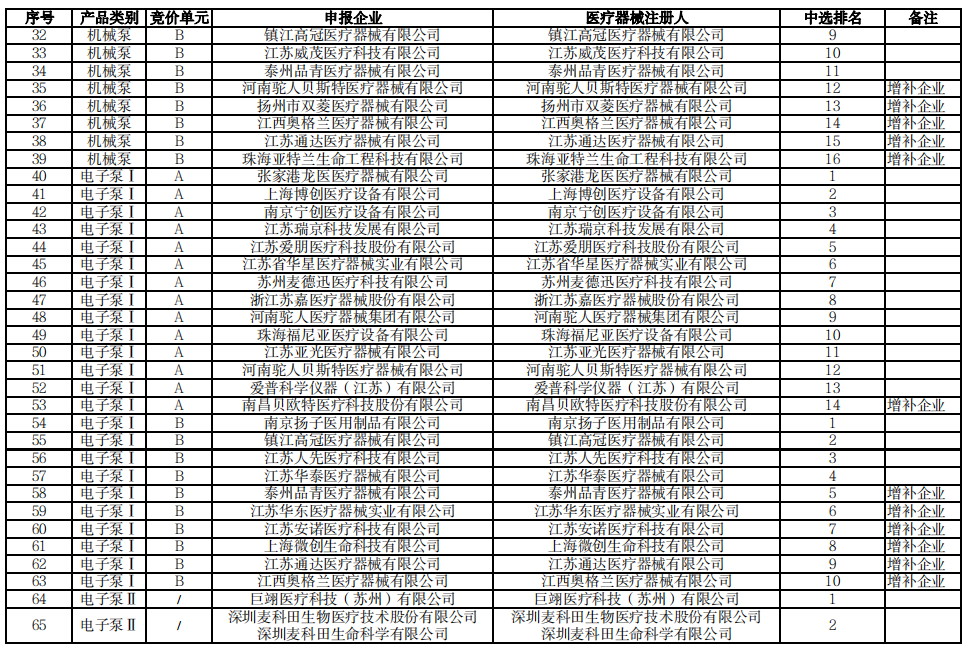 輸注泵中選結(jié)果如下: