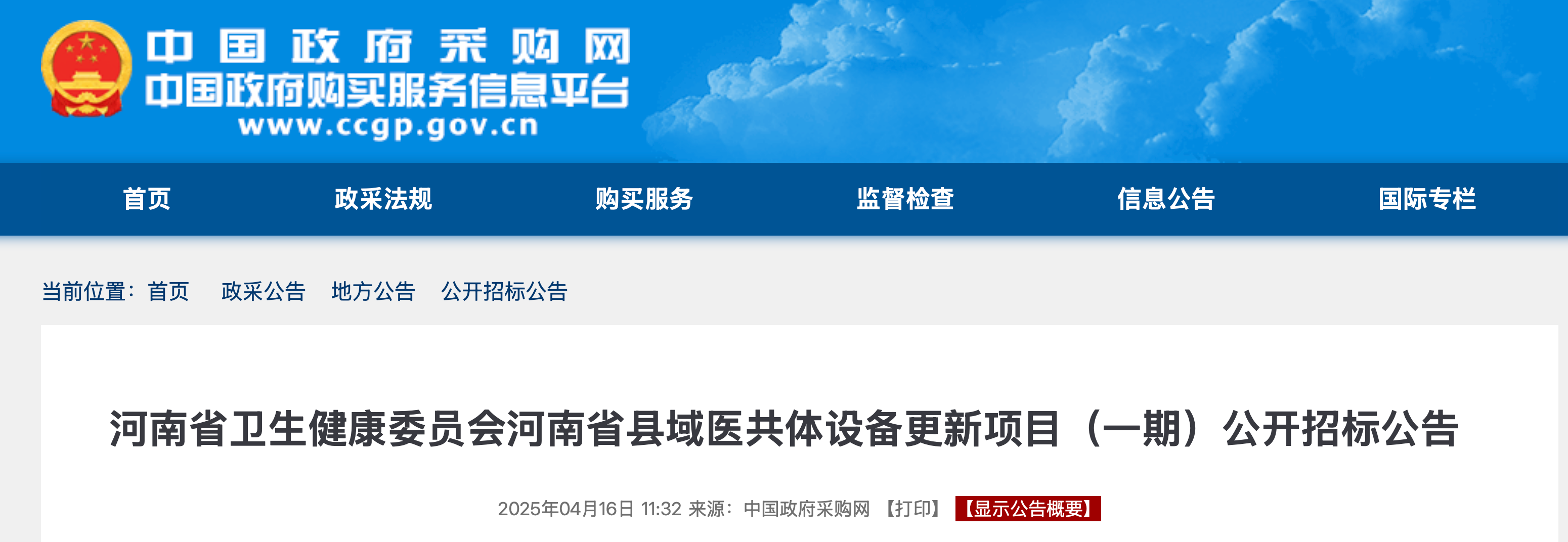 4月16日,中國(guó)政府采購(gòu)網(wǎng)發(fā)布《河南省衛(wèi)生健康委員會(huì)河南省縣域醫(yī)共體設(shè)備更新項(xiàng)目(一期)公開(kāi)招標(biāo)公告》,具體分為是11個(gè)招標(biāo)公告,總預(yù)算為9.09億元,05月12日開(kāi)標(biāo)。