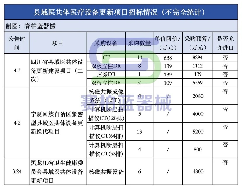 據(jù)賽柏藍(lán)器械梳理,湖南、四川、河北、黑龍江、河南、寧夏等多地已先后推進(jìn)縣域醫(yī)共體設(shè)備更新工作,采購(gòu)設(shè)備包括核磁、CT、DR、超聲、全自動(dòng)生化分析儀、生化、救護(hù)車(chē)等。