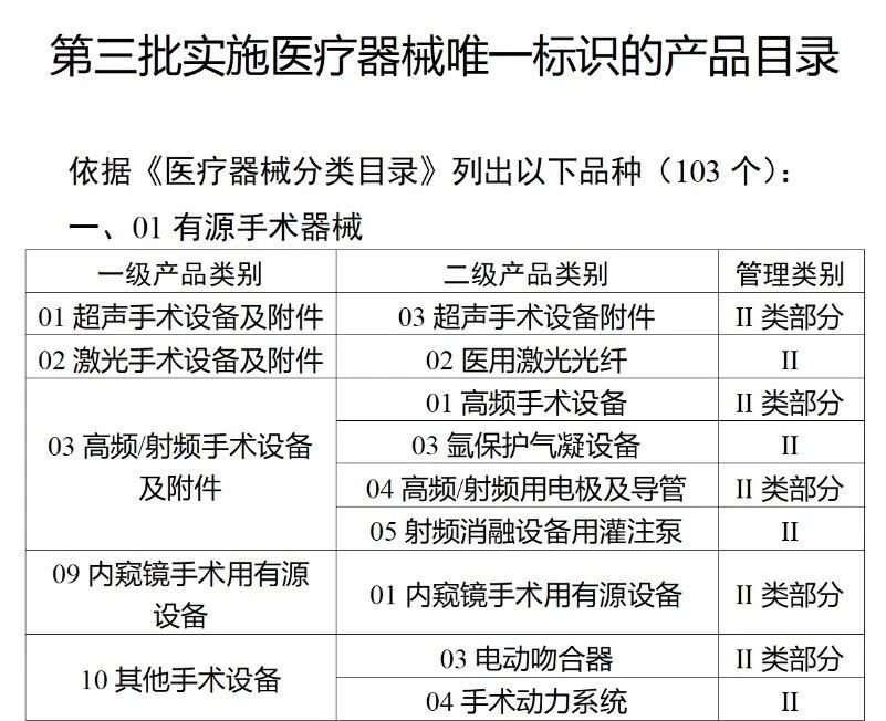 今年2月,國家藥監(jiān)局、國家衛(wèi)健委、國家醫(yī)保局發(fā)布《關(guān)于做好第三批實施醫(yī)療器械唯一標識工作的公告》(以下簡稱《公告》),按照風險程度和監(jiān)管需要,確定部分臨床需求量較大的一次性使用產(chǎn)品、集中帶量采購中選產(chǎn)品、醫(yī)療美容相關(guān)產(chǎn)品等部分第二類醫(yī)療器械作為第三批醫(yī)療器械唯一標識實施品種。