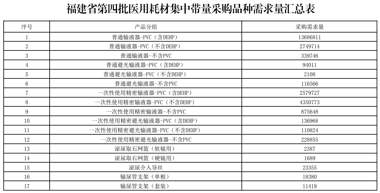 10月發(fā)布的《福建省第四批醫(yī)用耗材集中帶量采購公告(第6號)》公布了上述四類耗材采購需求量,其中普通輸液器-PVC(含DEHP)最高,達到了13686811個。