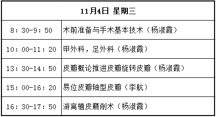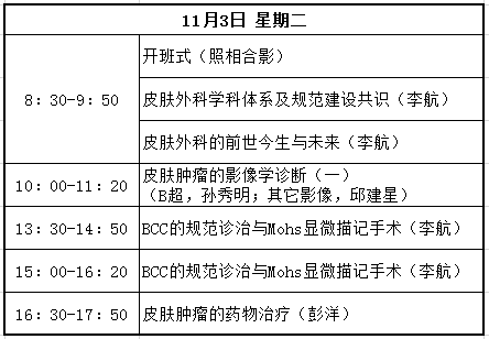 課程內(nèi)容涉及皮膚外科的各種理論和基本技能及常見(jiàn)術(shù)式,諸如皮瓣、植皮等復(fù)雜成形技術(shù),Mohs顯微描記手術(shù),毛發(fā)移植,磨削,腋臭微小切口手術(shù),皮膚腫瘤診治、激光美容、皮膚鏡應(yīng)用等。主要授課人包括李航、楊淑霞、涂平等多年從事皮膚外科或皮膚病理的專家。課程時(shí)間