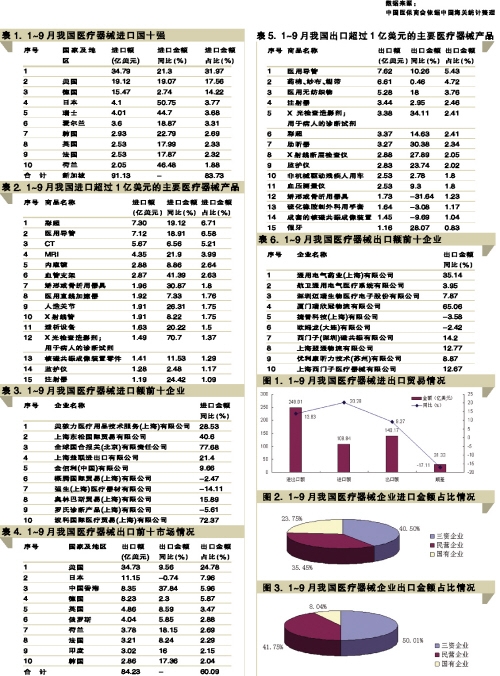 從1~9月進(jìn)出口金額情況可以看出,我國醫(yī)療器械貿(mào)易順差不斷縮小,主要原因在于全球醫(yī)療器械市場競爭激烈,我國醫(yī)療器械市場需求持續(xù)擴(kuò)大,部分企業(yè)已在維持一定出口貿(mào)易的基礎(chǔ)上,將重心轉(zhuǎn)移至國內(nèi)市場。從具體產(chǎn)品看,進(jìn)口產(chǎn)品中仍以彩超、CT、MRI、內(nèi)窺鏡、血管支架和直線加速器等高科技、高附加值產(chǎn)品為主。在出口的產(chǎn)品中,以藥棉、紗布、繃帶、醫(yī)用無紡布和注射器等低附加值產(chǎn)品為主,出口的彩超、CT和MRI也大多為在華的外資公司的產(chǎn)品。從企業(yè)結(jié)構(gòu)看,進(jìn)口企業(yè)中,民營企業(yè)和三資企業(yè)在企業(yè)數(shù)量和進(jìn)口金額上相差不大。但在出口企業(yè)中,民營企業(yè)數(shù)量比三資企業(yè)多將近1萬家,但三資企業(yè)出口金額的比重卻高達(dá)50.01%。