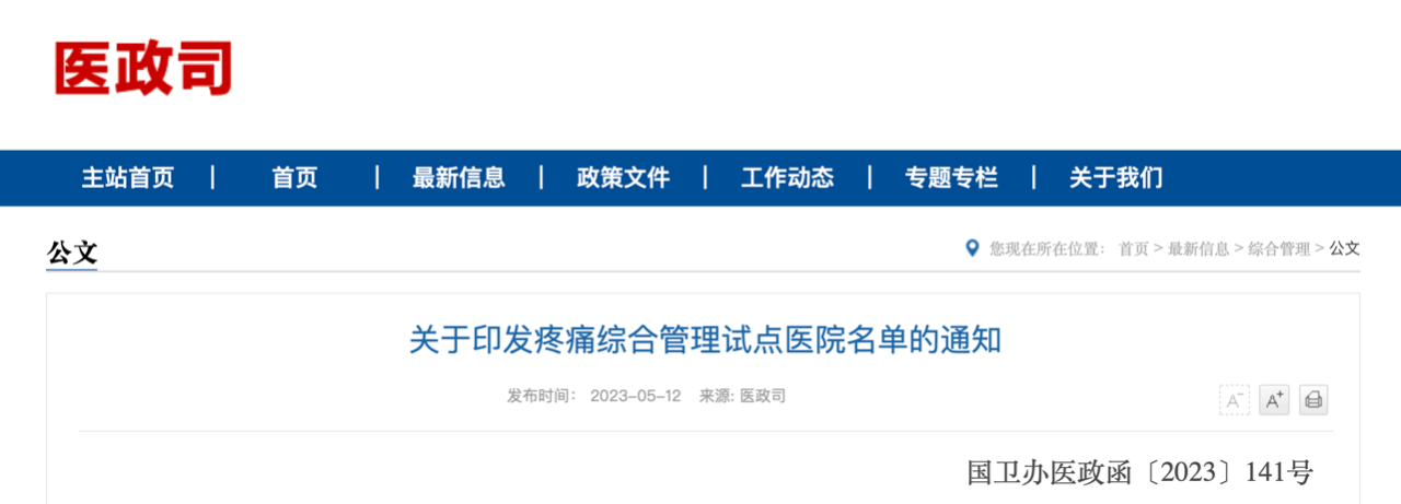 5月12日,國家衛(wèi)生健康委辦公廳、國家中醫(yī)藥局綜合司發(fā)布《關(guān)于印發(fā)疼痛綜合管理試點(diǎn)醫(yī)院名單的通知》(以下簡稱《通知》)。
