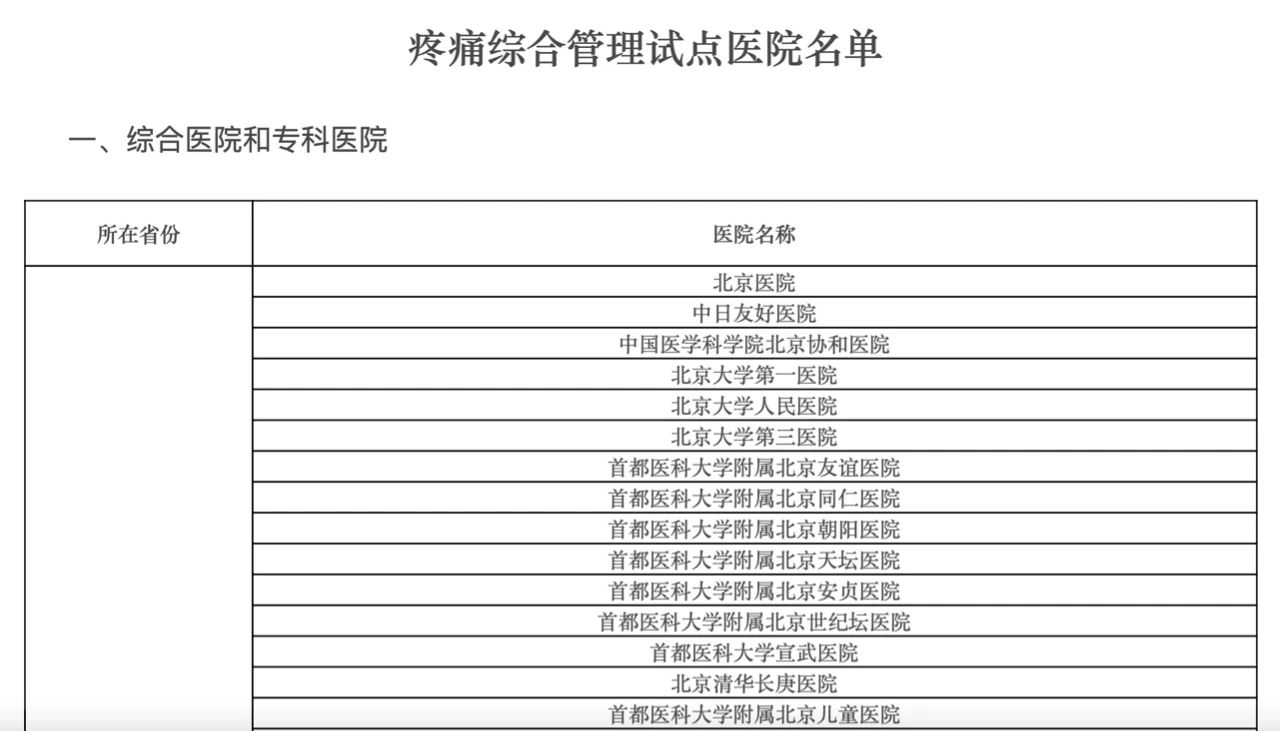 《通知》指出,根據(jù)《關(guān)于印發(fā)疼痛綜合管理試點(diǎn)工作方案的通知》,經(jīng)各省(區(qū)、市)及新疆生產(chǎn)建設(shè)兵團(tuán)推薦,國家衛(wèi)生健康委聯(lián)合國家中醫(yī)藥局研究確定了疼痛綜合管理試點(diǎn)醫(yī)院名單。