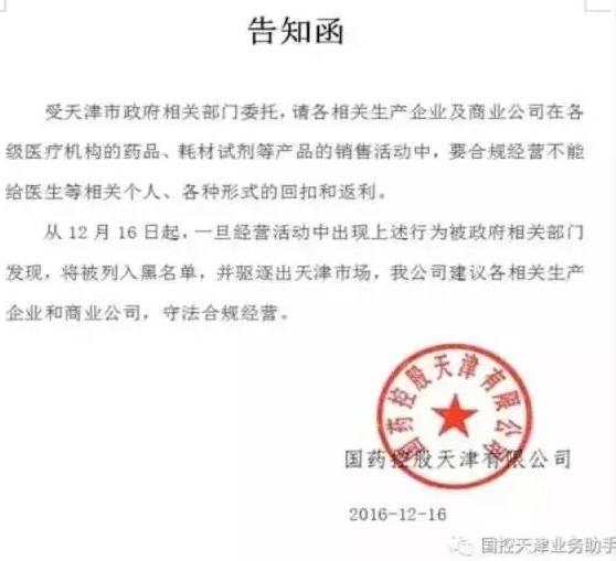 天津市衛(wèi)計(jì)委在全市掀起了嚴(yán)厲整肅行業(yè)不正之風(fēng)的專項(xiàng)行動,各大醫(yī)院紛紛展開部署,收取紅包、回扣等行為。而天津國控和華潤天津醫(yī)藥兩大商業(yè)巨頭,也同時向其配送的生產(chǎn)企業(yè)和商業(yè)公司發(fā)通知,勿在對醫(yī)療機(jī)構(gòu)的藥品、耗材、試劑等產(chǎn)品銷售活動中給醫(yī)生送回扣或返利。