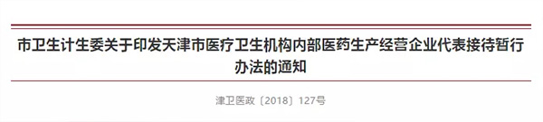 5月18日,天津市衛(wèi)計(jì)委印發(fā)《天津市醫(yī)療衛(wèi)生機(jī)構(gòu)內(nèi)部醫(yī)藥生產(chǎn)經(jīng)營(yíng)企業(yè)代表接待暫行辦法》(以下簡(jiǎn)稱暫行辦法)。