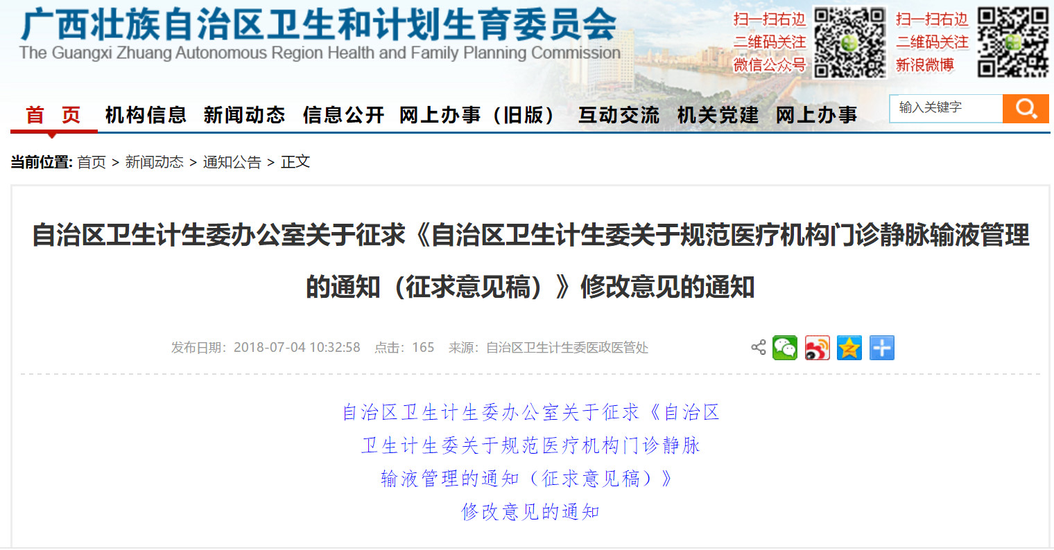 7月4日,廣西衛(wèi)計(jì)委發(fā)布“自治區(qū)衛(wèi)生計(jì)生委辦公室關(guān)于征求《自治區(qū)衛(wèi)生計(jì)生委關(guān)于規(guī)范醫(yī)療機(jī)構(gòu)門診靜脈輸液管理的通知(征求意見稿)》修改意見的通知”(以下簡(jiǎn)稱《通知》)。
