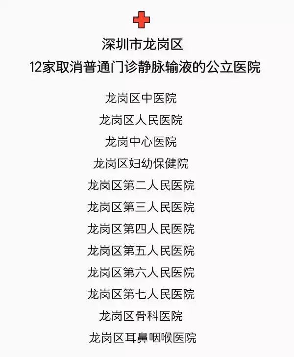 (一)龍崗區(qū)各公立醫(yī)院(含一級(jí)醫(yī)院),除急診科外,全面停止普通門診靜脈輸液服務(wù)。