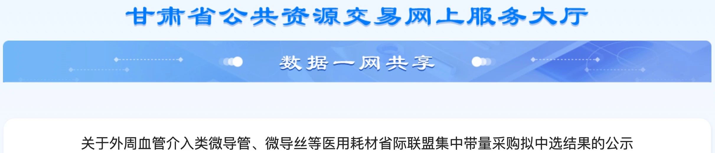 12月27日,甘肅省公共資源交易中心發(fā)布《關(guān)于外周血管介入類微導(dǎo)管、微導(dǎo)絲等醫(yī)用耗材省際聯(lián)盟集中帶量采購(gòu)擬中選結(jié)果的公示》。