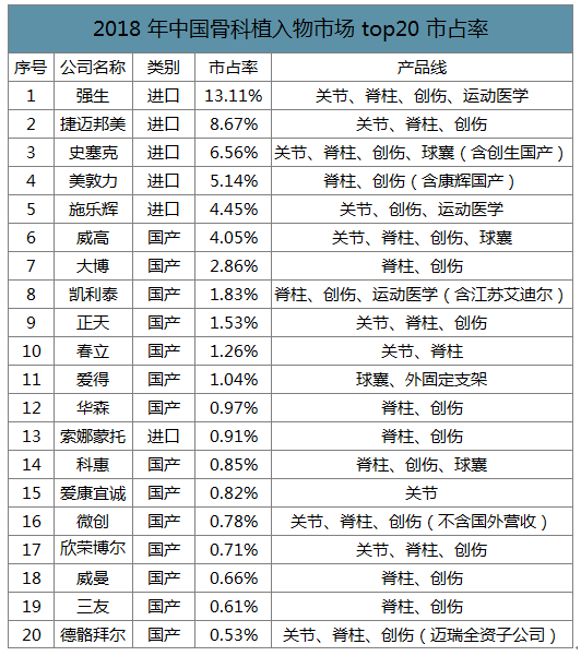 根據(jù)智研咨詢(xún)行業(yè)報(bào)告數(shù)據(jù),2018年中國(guó)骨科植入物市場(chǎng)前5名及市場(chǎng)份額分別為:強(qiáng)生13.11%、捷邁邦美8.67%、史賽克6.56%、美敦力5.14%、施樂(lè)輝4.4%。
