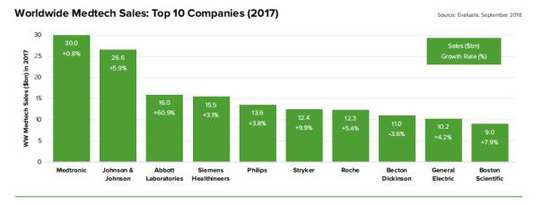2017年美國的美敦力(Medtronic)仍然占據(jù)榜首的位置,銷售額高達300億美元,市場占有率為7.4%;雅培(Abbott Laboratories)2017年銷售額增長了60.9%, 這主要是由于其在年初并購了 St. Jude Medica,這使其一躍升為全球第三大醫(yī)療器械公司;而美國的BD公司(Becton Dickinson)是TOP20中唯一一個在過去12個月中出現(xiàn)負(fù)增長的公司,主要是由于其呼吸領(lǐng)域業(yè)務(wù)的剝離。