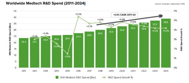 全球醫(yī)療器械行業(yè)研發(fā)投入趨勢:預(yù)測未來幾年年平均增長率約為4.5%,到2024年全球醫(yī)療器械研發(fā)總投入約為390億美元,但研發(fā)占銷售額的比重將從2017年的8.7%降低至8.1%。