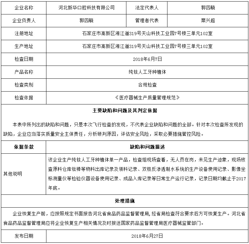 對(duì)河北新華口腔科技有限公司飛行檢查通報(bào)