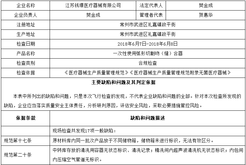 對(duì)江蘇錢璟醫(yī)療器械有限公司飛行檢查通報(bào)