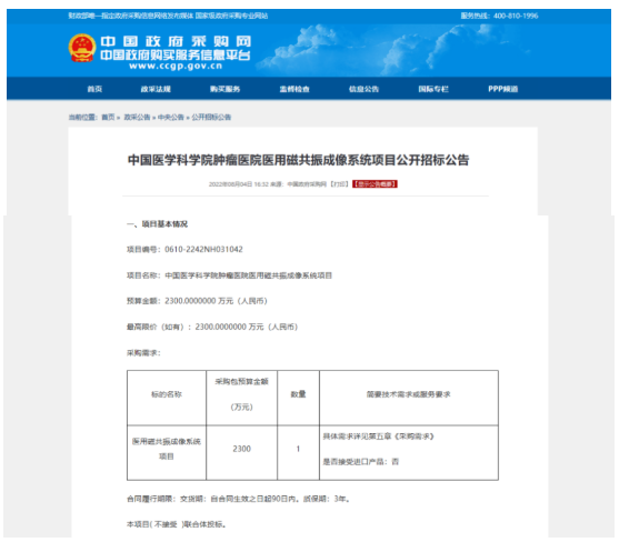 中國政府采購網(wǎng)日前發(fā)布《中國醫(yī)學(xué)科學(xué)院腫瘤醫(yī)院醫(yī)用磁共振成像系統(tǒng)項(xiàng)目公開招標(biāo)公告》(下稱《公告》),中國醫(yī)學(xué)科學(xué)院腫瘤醫(yī)院準(zhǔn)備以2300萬采購醫(yī)用磁共振成像系統(tǒng),并明確表示“不接受進(jìn)口產(chǎn)品”。