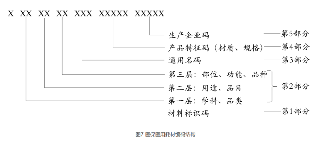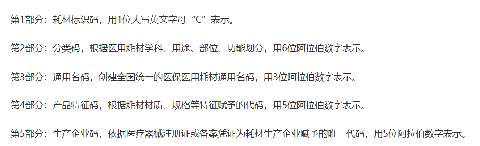 根據(jù)國家醫(yī)保局印發(fā)的《醫(yī)療保障標準化工作指導意見》,醫(yī)保醫(yī)用耗材編碼分5個部分共20位,通過大寫英文字母和阿拉伯數(shù)字按特定順序排列表示。其中第1部分是耗材標識碼,第2部分是分類碼,第3部分是通用名碼,第4部分是產(chǎn)品特征碼,第5部分是生產(chǎn)企業(yè)碼。