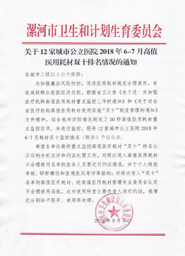 近日,河南省漯河市衛(wèi)生計生委員會發(fā)布《關于12家城市公立醫(yī)院2018年6-7月高值醫(yī)用耗材雙十排名情況的通知》(下稱《通知》),曝光了全國首份醫(yī)院耗材用量連續(xù)兩個月排名前十的名單,以及耗材使用量大的醫(yī)務人員。