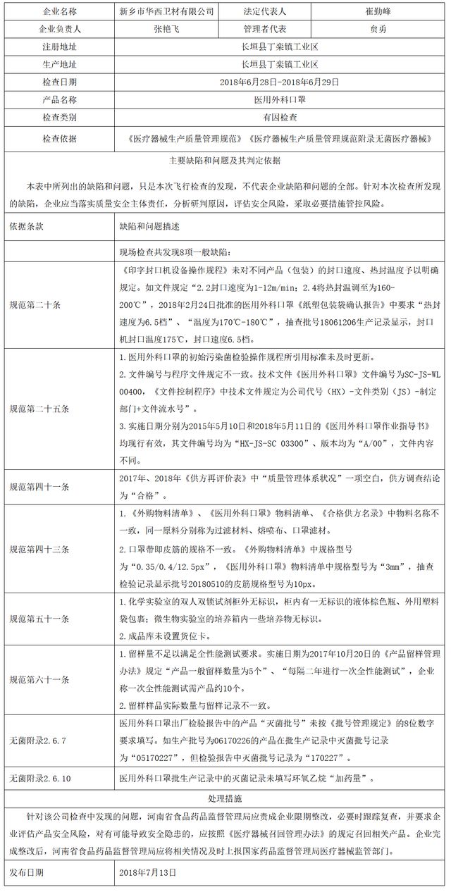 對新鄉(xiāng)市華西衛(wèi)材有限公司飛行檢查通報