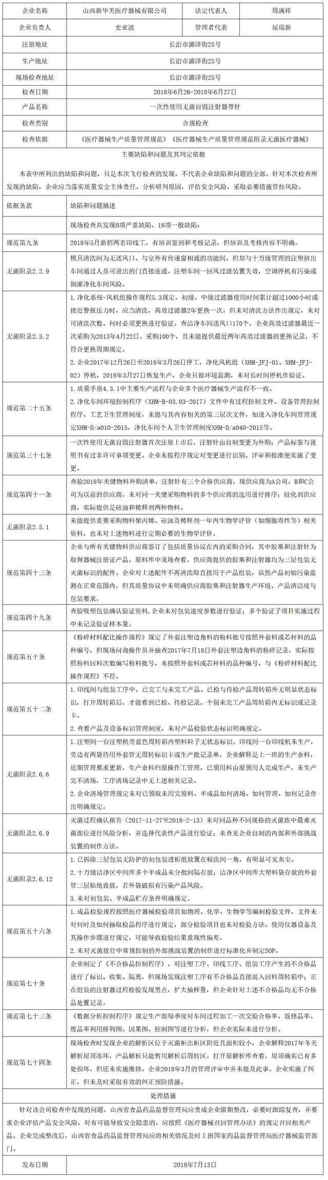 對山西新華美醫(yī)療器械有限公司飛行檢查通報
