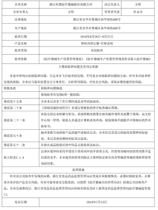 對浙江科惠醫(yī)療器械股份有限公司飛行檢查通報