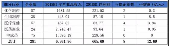筆者統(tǒng)計的281家上市藥企業(yè)績顯示,營業(yè)總收入達(dá)到6,900多億元,凈利潤665.69億元。其中,盈利的企業(yè)273家,合計凈利潤678.38億元,虧損企業(yè)8家,虧損額12.69億元。