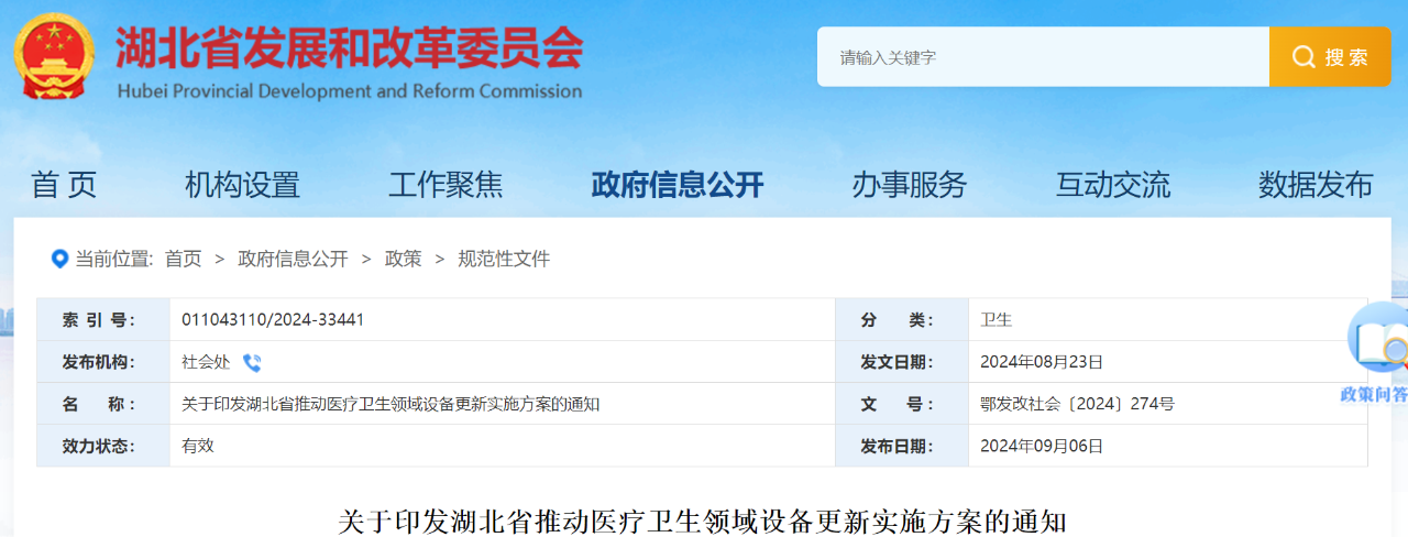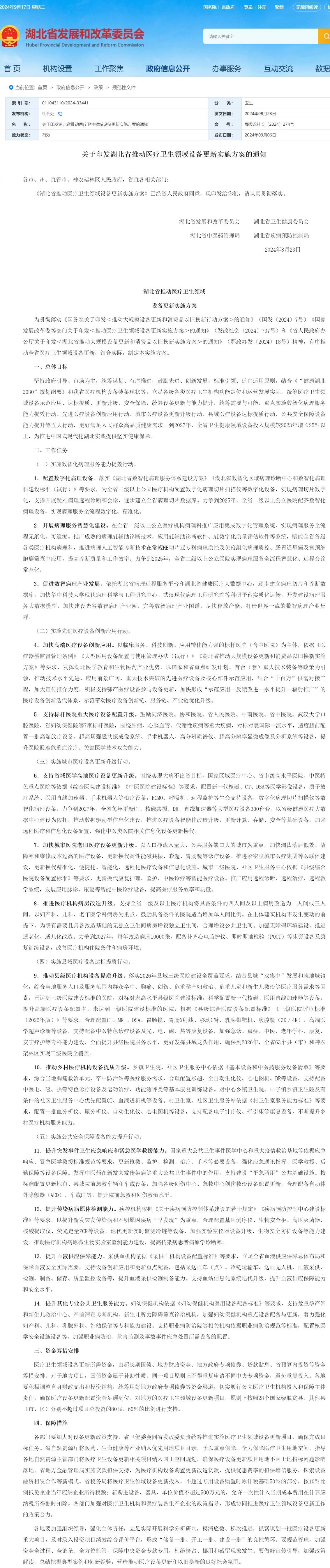 近日,湖北省發(fā)改委印發(fā)《湖北省推動(dòng)醫(yī)療衛(wèi)生領(lǐng)域設(shè)備更新實(shí)施方案》(完整見(jiàn)文末)。