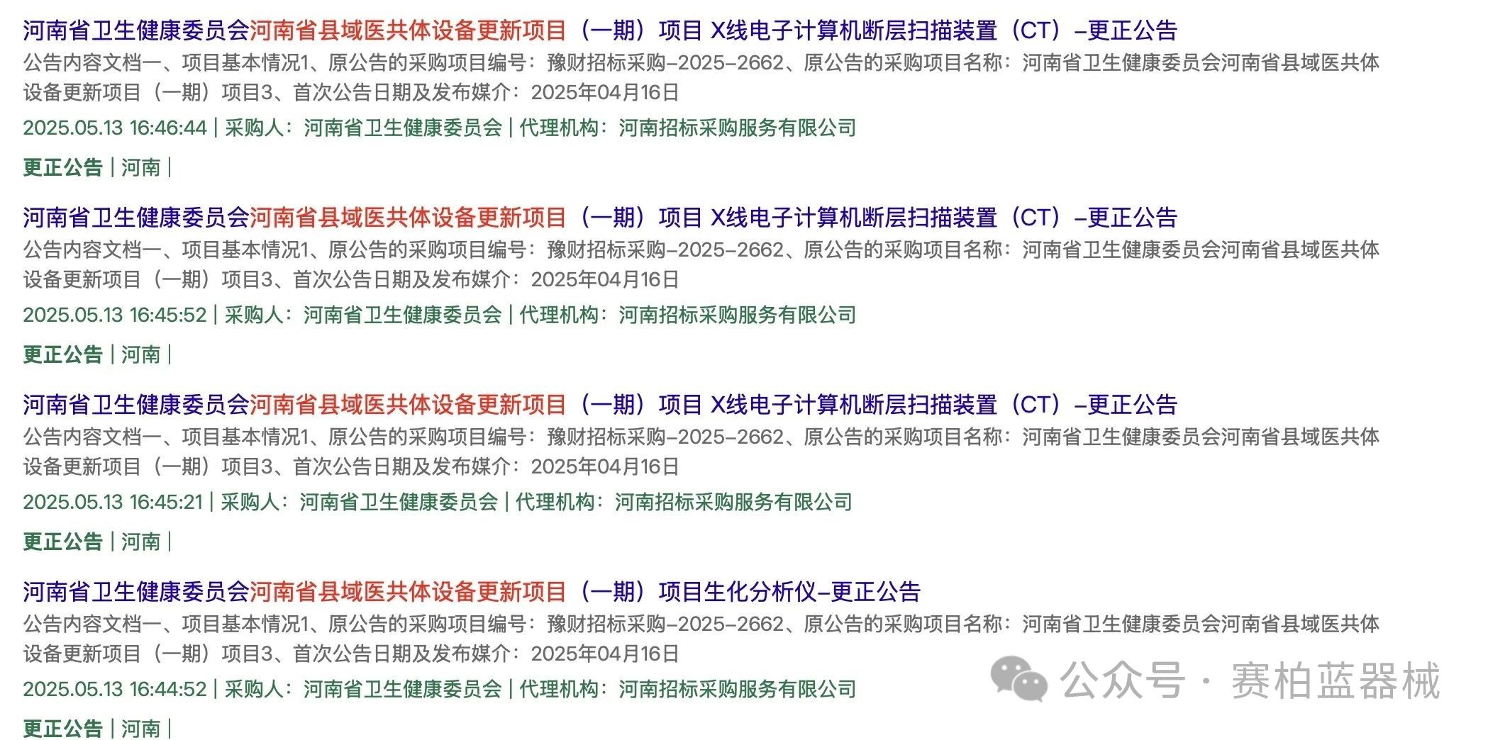 根據(jù)《公告》,河南省縣域醫(yī)共體設(shè)備更新項目(一期)項目于2025年05月11日09時51分被叫停。該項目覆蓋設(shè)備類型包括16排、32排、64排X線電子計算機斷層掃描裝置(CT)和生化分析儀800速、400速。