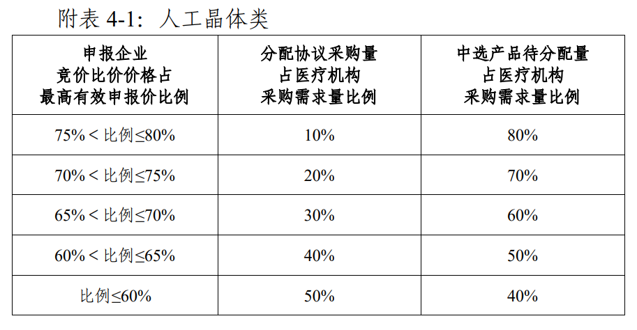 與脊柱國采類似,此次集采擬中選規(guī)則中的規(guī)則二,是行業(yè)俗稱的“躺平復(fù)活”機(jī)制。其中,人工晶體降40%、運(yùn)動(dòng)醫(yī)學(xué)降60%可獲得擬中選資格(具體折算規(guī)則、適用范圍見文件)。此外,第四批國采還增加了規(guī)則三:對(duì)于申報(bào)企業(yè)不超過2家的競(jìng)價(jià)單元,人工晶體降20%、運(yùn)動(dòng)醫(yī)學(xué)降30%可獲得擬中選資格。