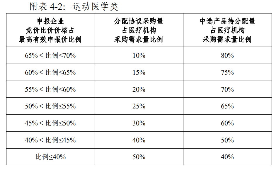 對(duì)于有效申報(bào)企業(yè)數(shù)為1家和2家的競(jìng)價(jià)單元,將根據(jù)申報(bào)企業(yè)競(jìng)價(jià)比價(jià)價(jià)格占最高有效申報(bào)價(jià)的比例,梯度分配醫(yī)療機(jī)構(gòu)協(xié)議采購量。需要注意的是,在這一競(jìng)價(jià)單元中,所有剩余量由醫(yī)療機(jī)構(gòu)分配給中選排名首位的中選企業(yè)。
