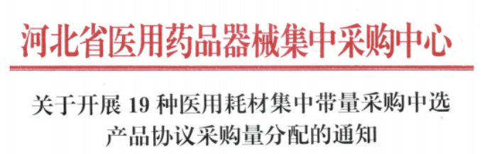 協(xié)議采購(gòu)量分配方面,近日業(yè)內(nèi)流傳出一份表頭為河北省醫(yī)用藥品器械集中采購(gòu)中心的“關(guān)于開(kāi)展19種醫(yī)用耗材集中帶量采購(gòu)中選產(chǎn)品協(xié)議采購(gòu)量分配的通知”。