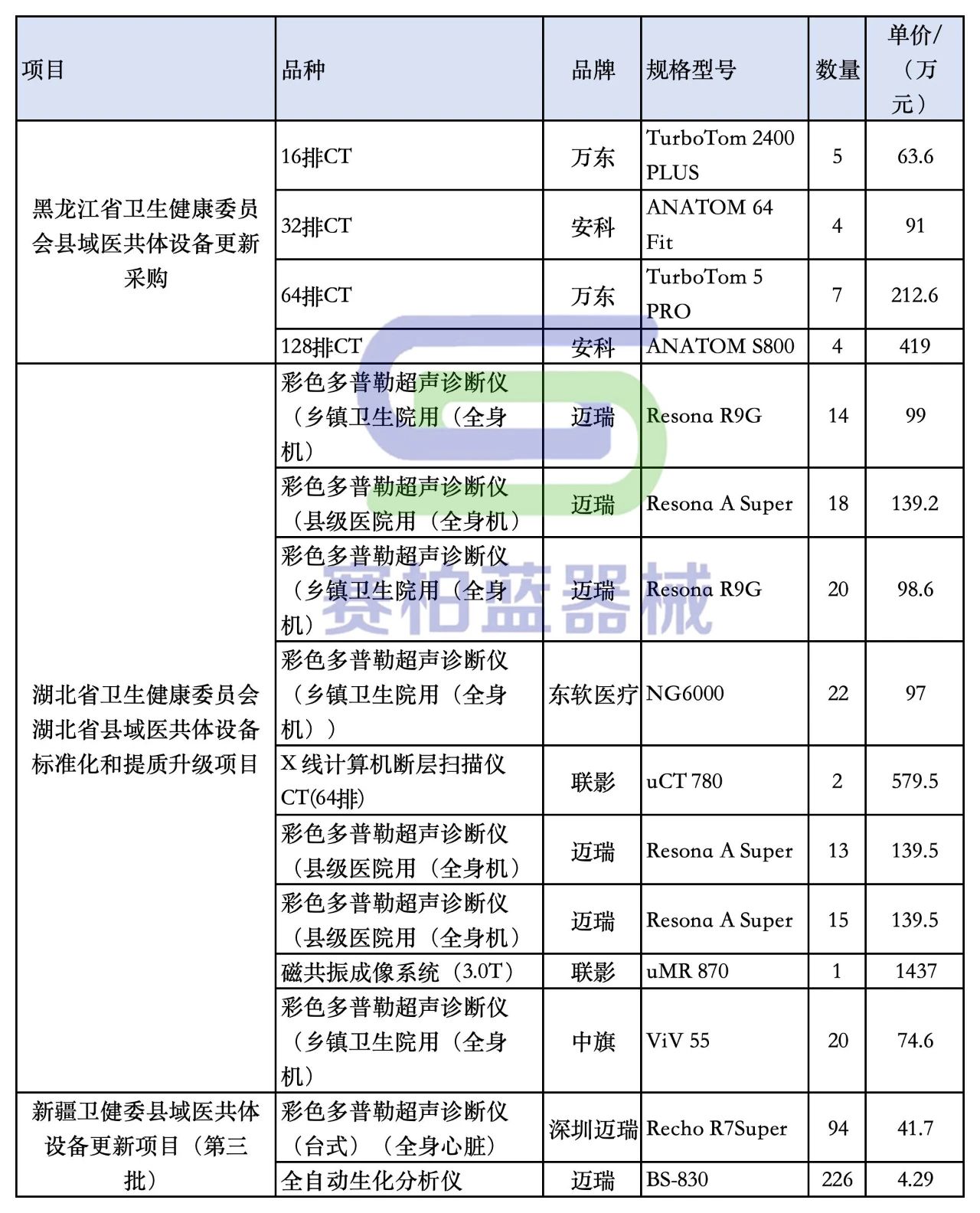 新疆衛(wèi)健委共采購多普勒胎心儀21臺、定量超聲骨密度檢測儀10臺、洗胃機(jī)24臺,預(yù)算146萬元;采購彩色多普勒超聲診斷儀(便攜式)36臺,預(yù)算900萬元;采購血液細(xì)胞分析儀189臺、尿液分析儀36臺,預(yù)算1533.6萬元;采購1.5TMRI核磁共振成像儀1臺、電子計算機(jī)X射線斷層掃描儀(64排及以上)2臺、移動C臂X線機(jī)4臺,預(yù)算1750萬元;采購除顫儀41臺、多參數(shù)監(jiān)護(hù)儀32臺、微量注射泵8臺,預(yù)算100.4萬元;采購動態(tài)心電圖檢測儀31臺、十二導(dǎo)心電圖機(jī)250臺、動態(tài)血壓機(jī)37臺,預(yù)算318萬元。