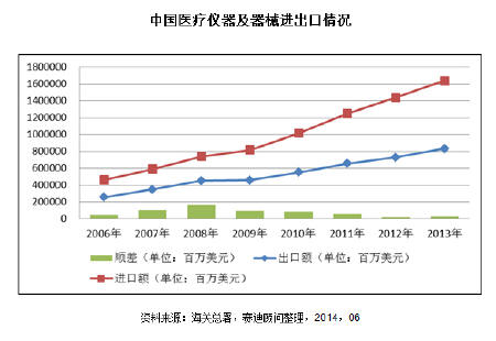 報(bào)告數(shù)據(jù)顯示,2013年我國(guó)醫(yī)療器械貿(mào)易總額達(dá)343.1億美元,同比增長(zhǎng)14.13%,較2012年增長(zhǎng)1個(gè)百分點(diǎn);其中,出口額為193.35億美元,同比增長(zhǎng)9.92%,較2012年下降了2個(gè)百分點(diǎn);進(jìn)口額為149.75億美元,同比增長(zhǎng)20.07%,較2012年增長(zhǎng)5.5個(gè)百分點(diǎn);貿(mào)易順差43.6億美元,同比下降14.8%。