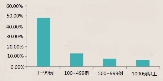 而2011年8月出臺的《心血管疾病介入診療技術(shù)管理規(guī)范(2011年版)》允許滿足規(guī)范要求硬性條件和相關(guān)規(guī)定的二級醫(yī)院開展心血管介入治療手術(shù)。而事實也表明,在2013年開展1~99例的醫(yī)院,PCI手術(shù)數(shù)年增長率達48.08%,遠遠超過全國平均的增速(圖4)。