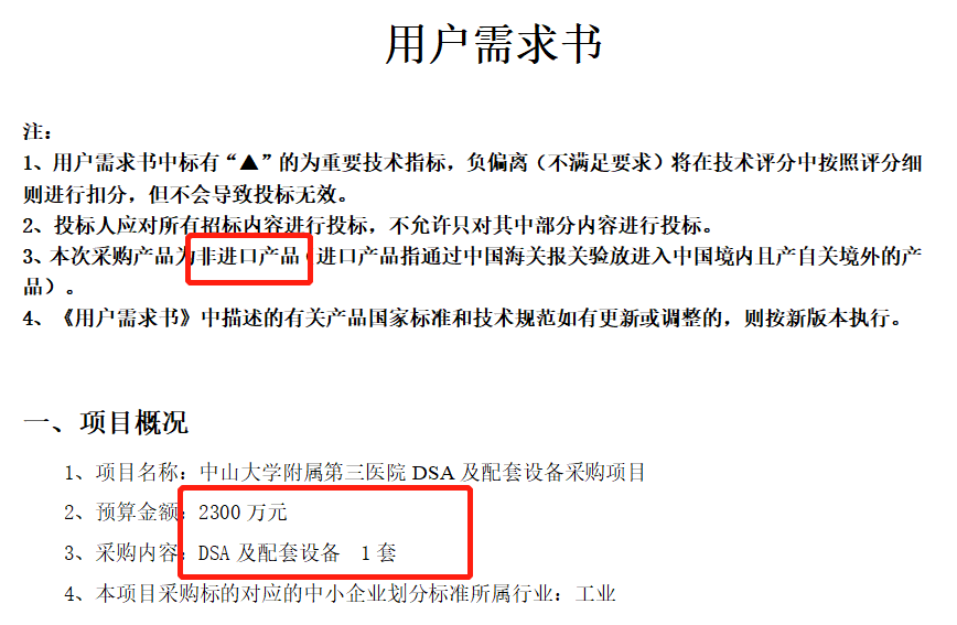 例如本次中山大學附屬第三醫(yī)院采購的“數(shù)字減影血管造影X射線機(DSA)”,這類設備一直處于嚴重依賴進口狀態(tài),很少有醫(yī)院采購時會明確拒絕進口產品投標,本次卻直接拒絕進口產品入場,無疑給足了國產品牌底氣。
